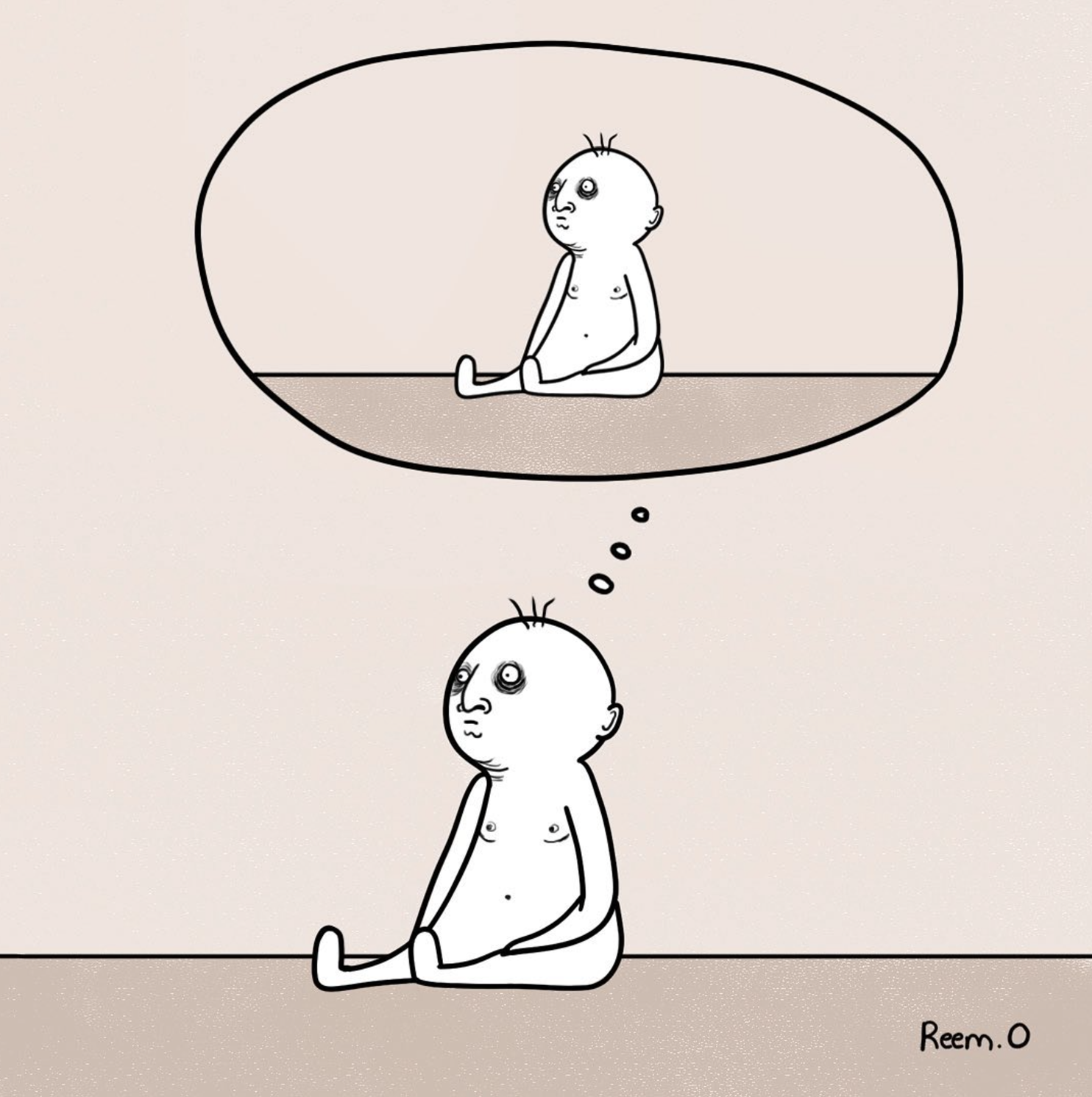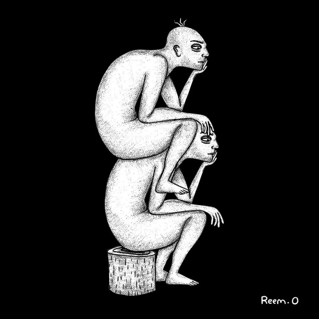 Surreal black and white illustration of two seated figures, one atop the other, both in a contemplative pose on a tree stump, against a black background.