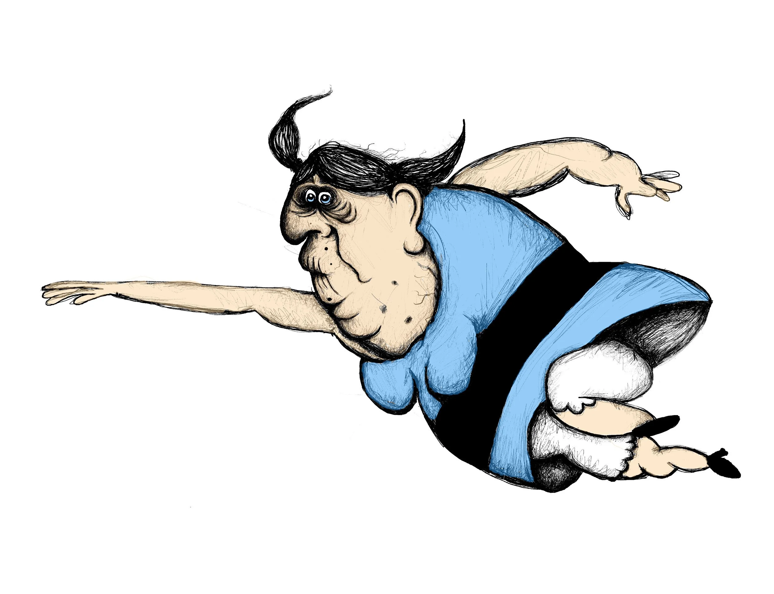 Cartoon character flying horizontally, wearing a blue outfit. The character has exaggerated features, a large nose, sagging skin, and black hair tied back. Arms are extended, suggesting motion.