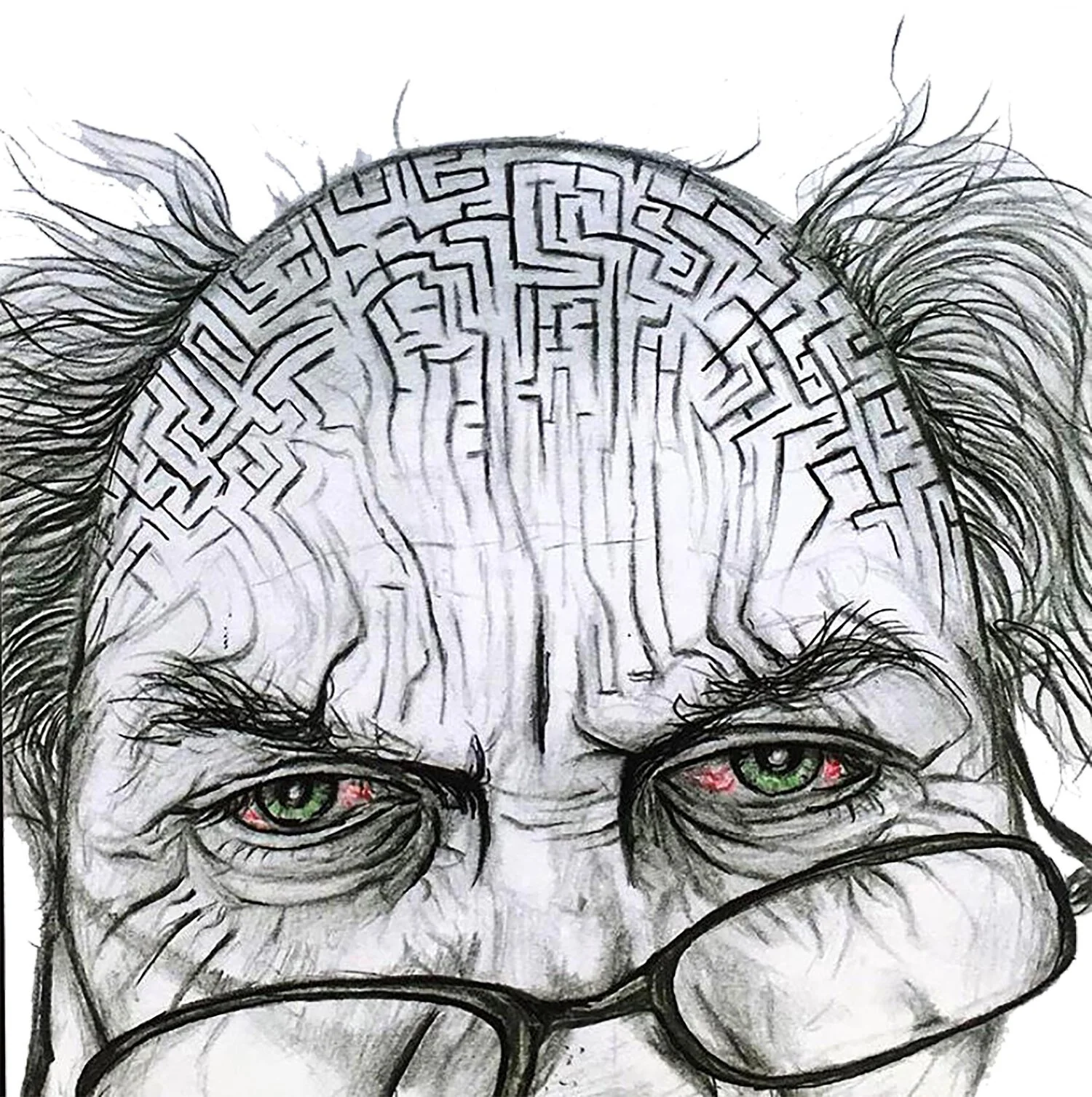 Illustration of a person's face with a maze pattern on the forehead, green eyes, and glasses.