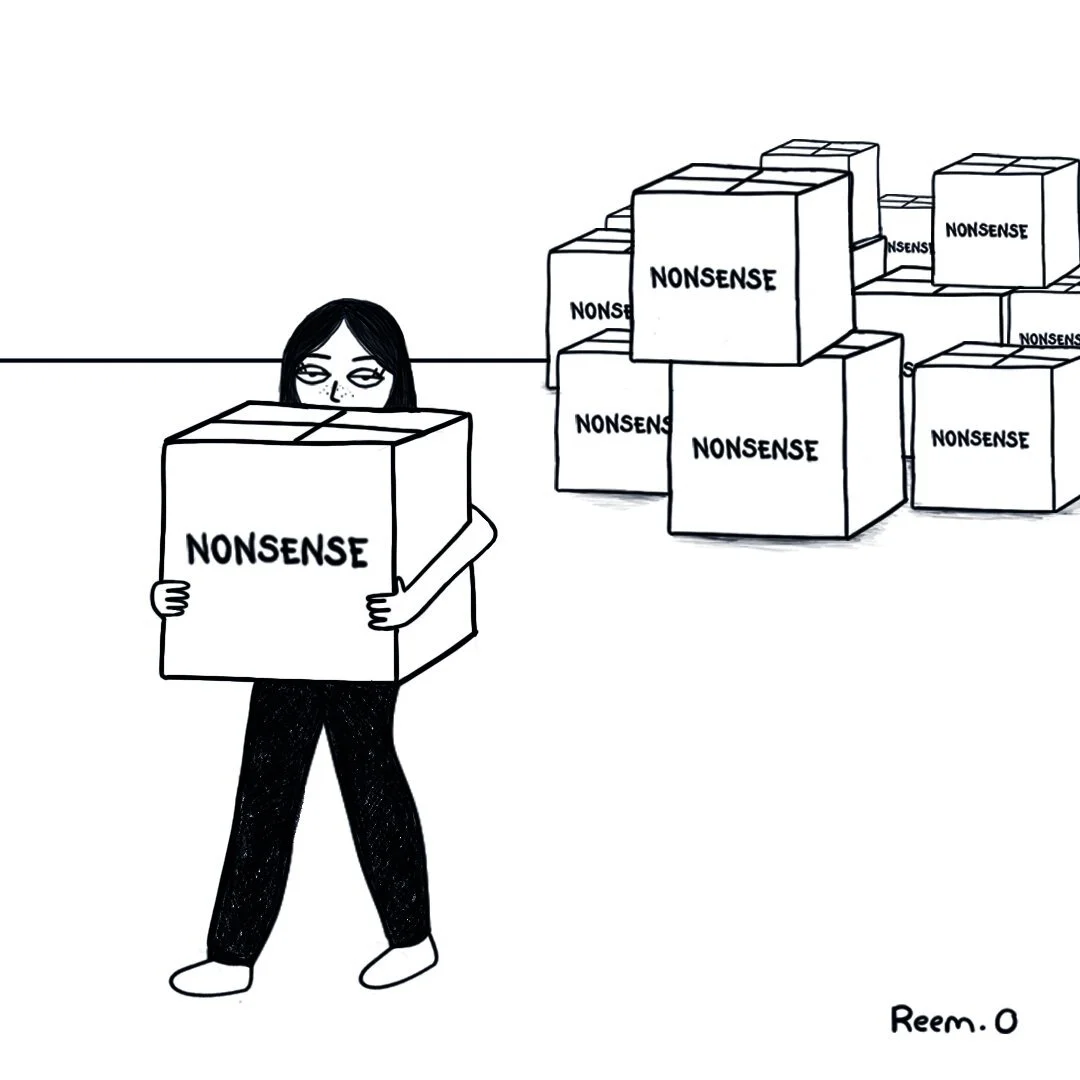 Cartoon of a person carrying a box labeled "Nonsense" among several similar boxes.