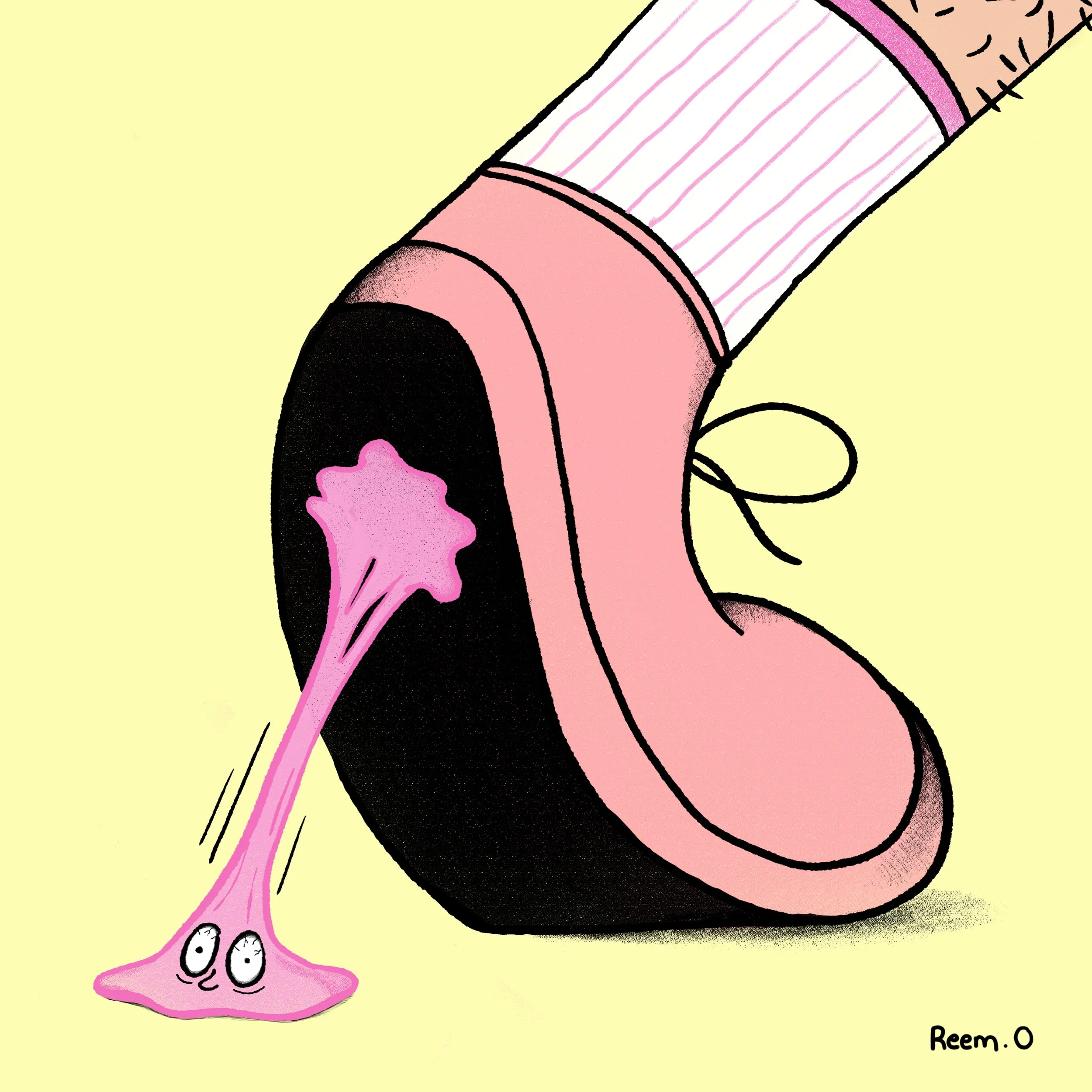 Illustration of a foot with a pink shoe stepping on smiling pink gum.