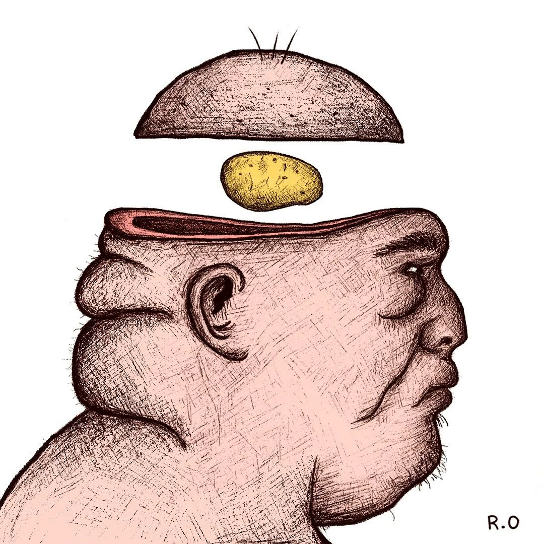Surreal artwork of a head with a detached top, revealing a potato. The figure has exaggerated features and a side profile.