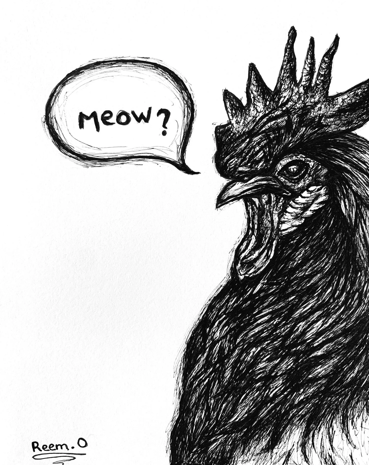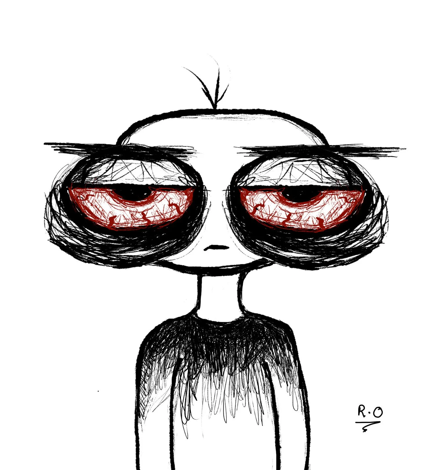 Cartoon character with exaggerated red, bloodshot eyes, messy black hair, and a blank expression. The drawing features sketchy lines and dark shading, giving it a tired or exhausted look. Signed with initials R.O.