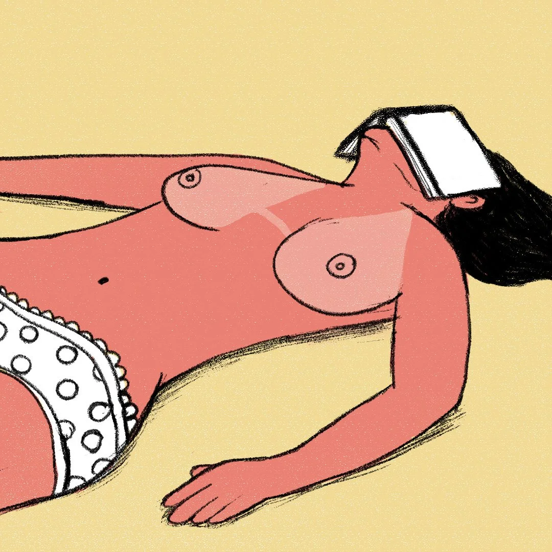 Illustration of a woman sunbathing on a beach, wearing polka-dotted underwear with a book covering her eyes.