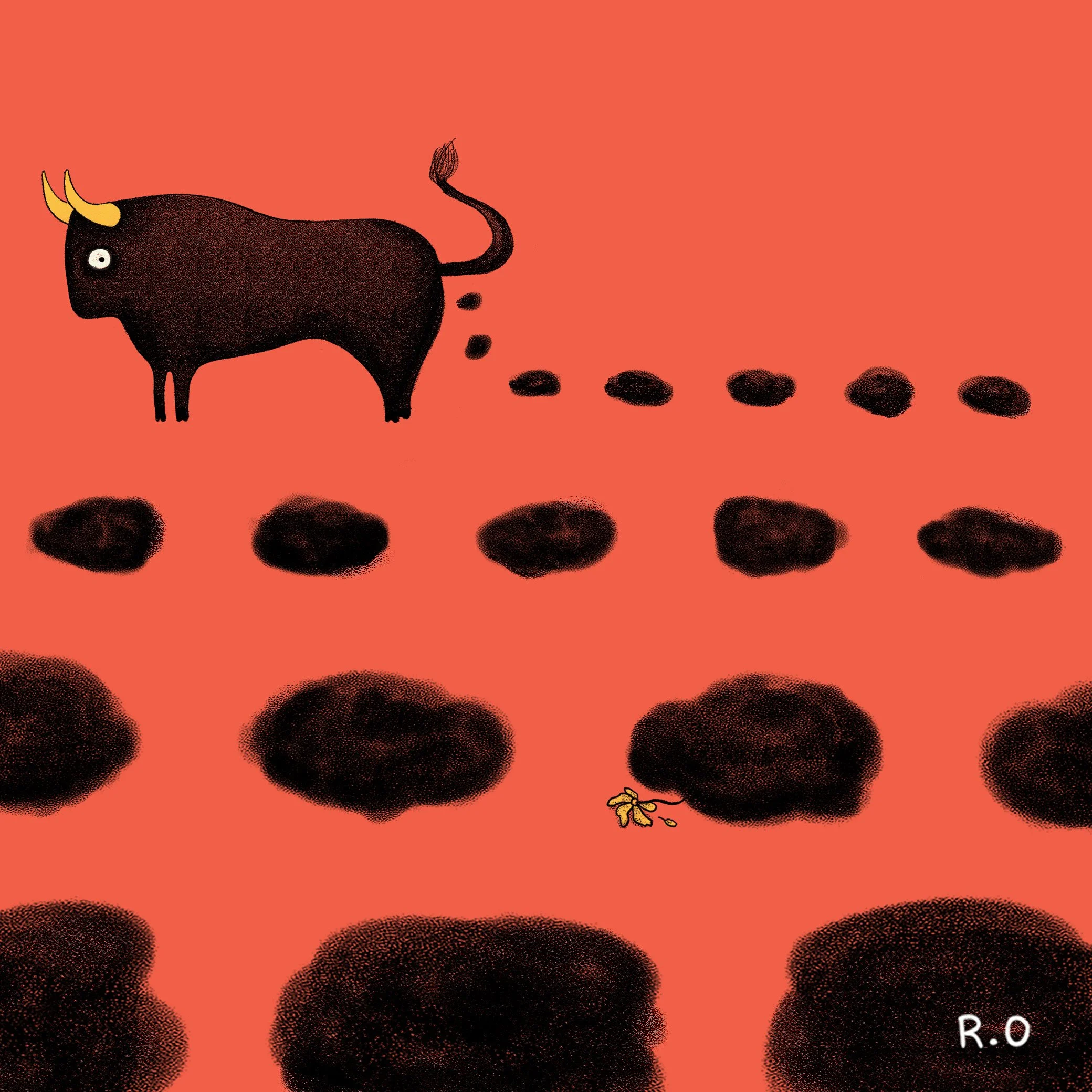 Illustration of a bull on an orange background with black heaps and a banana peel.