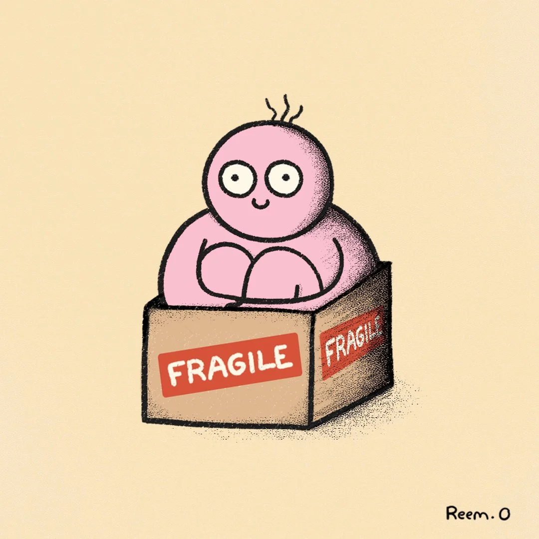 Cartoon character sitting in a cardboard box labeled 'Fragile'.